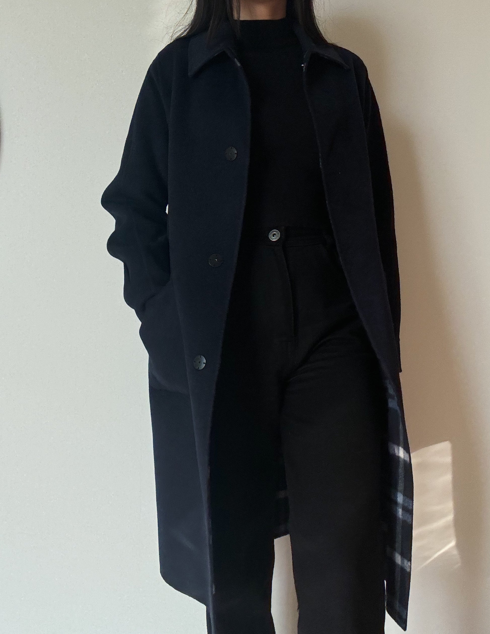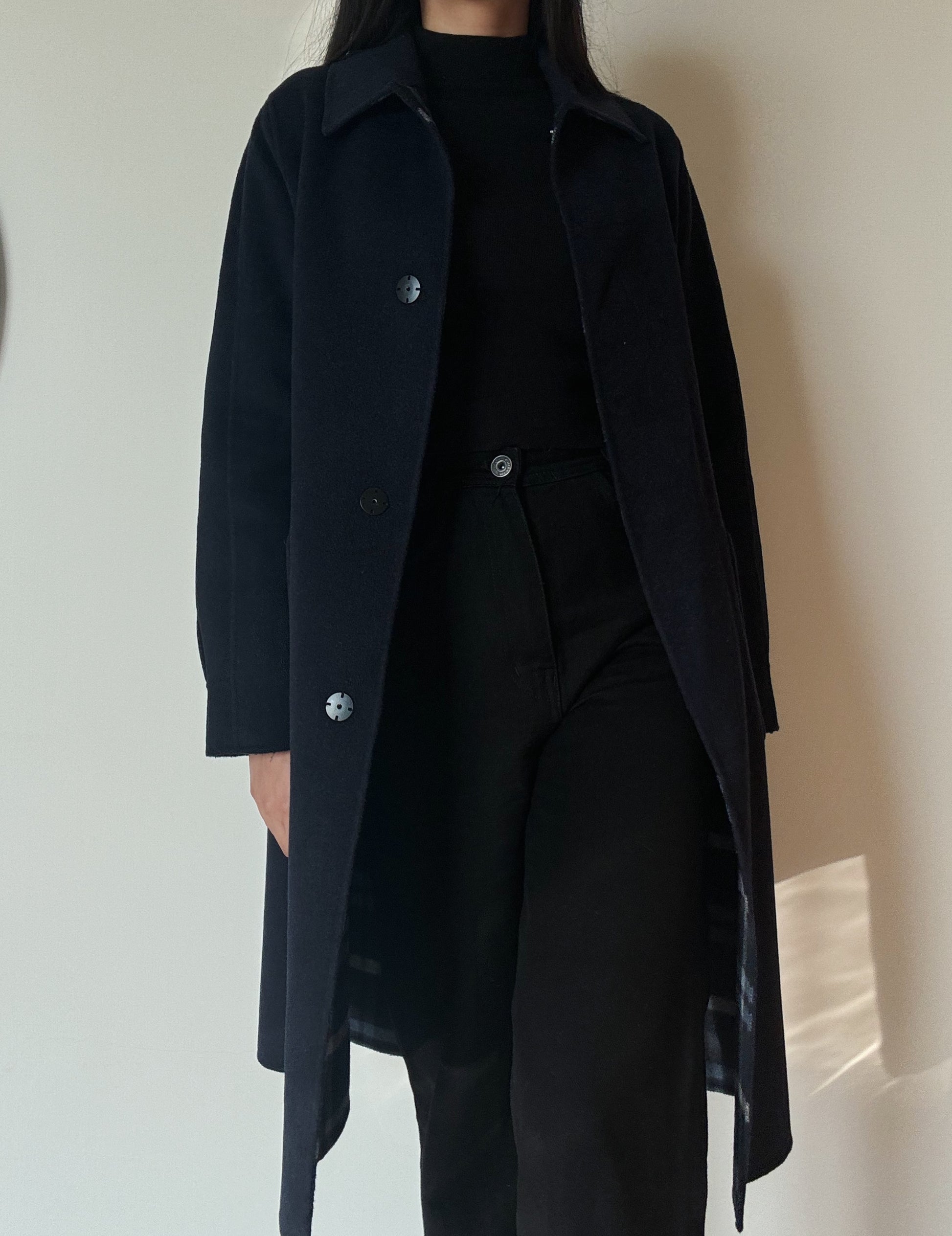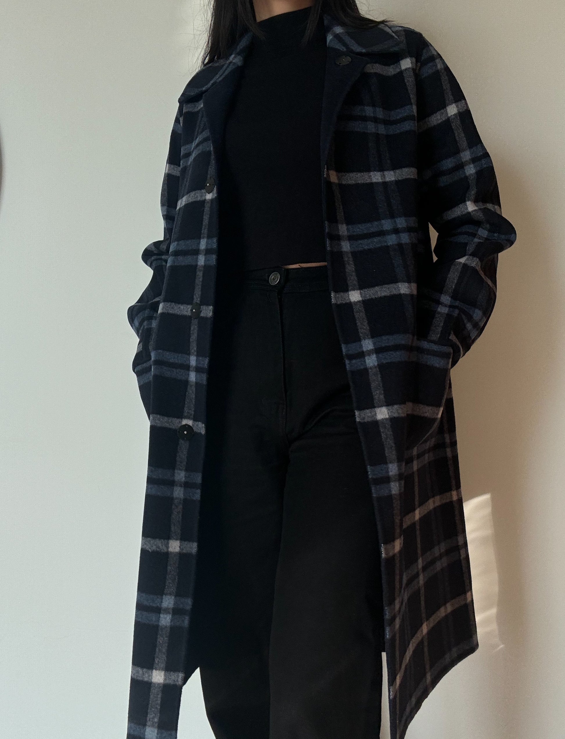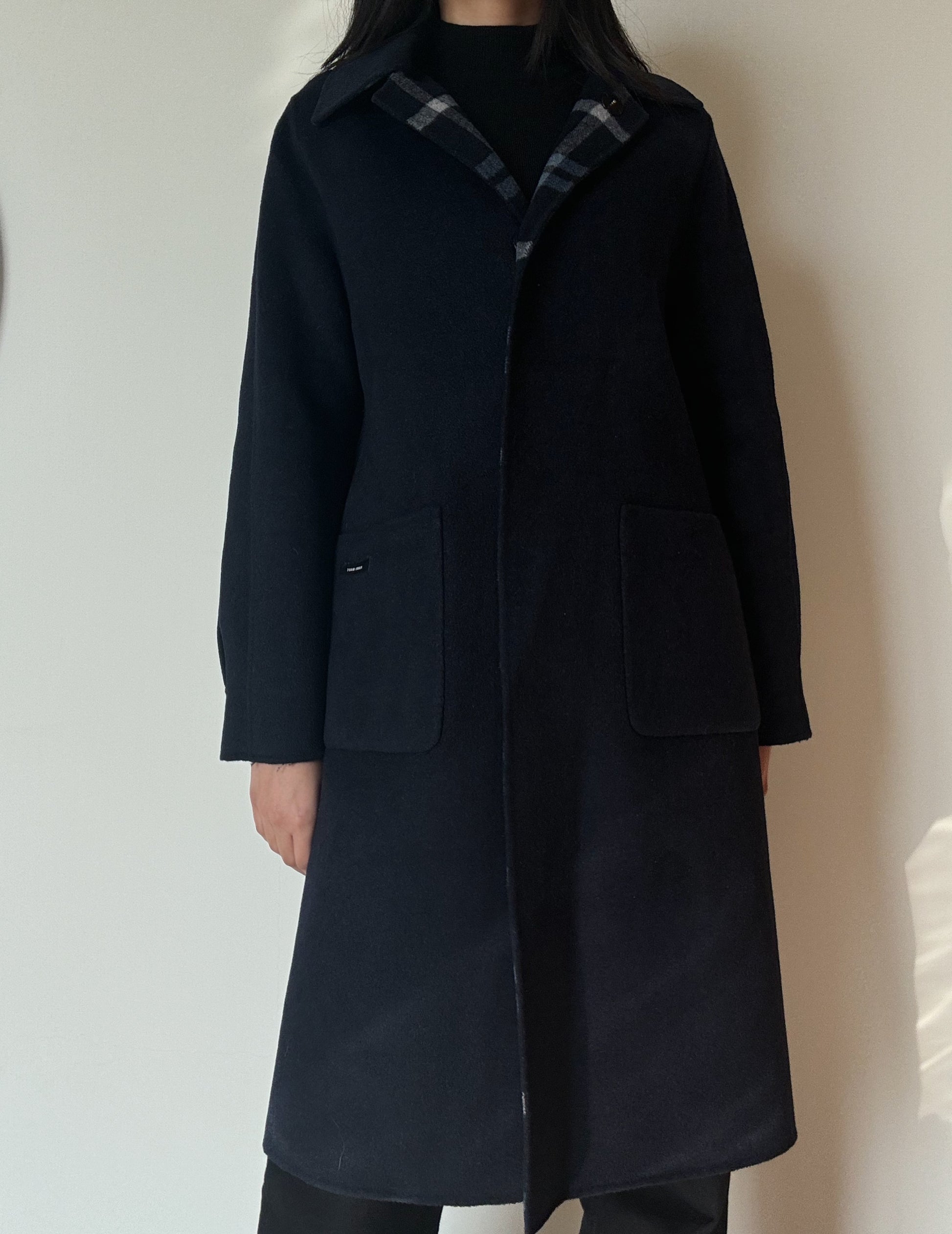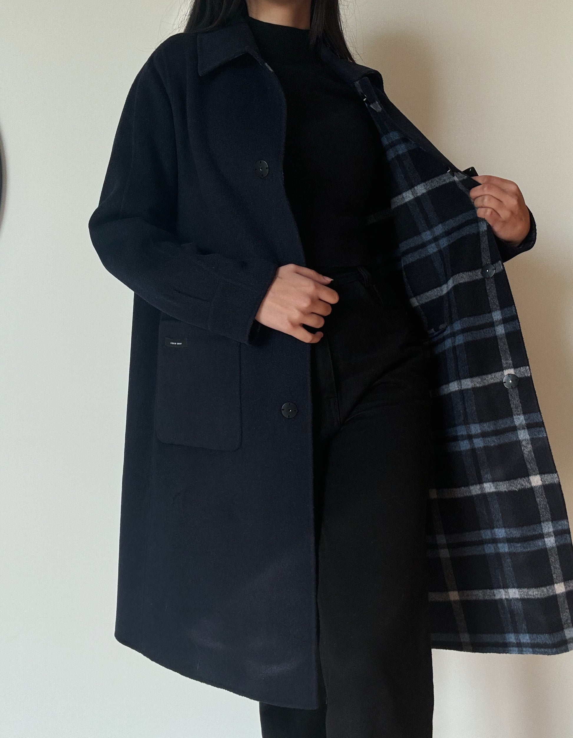 Gorgeous reversible coat, where it as in classic navy blue or checkered style.