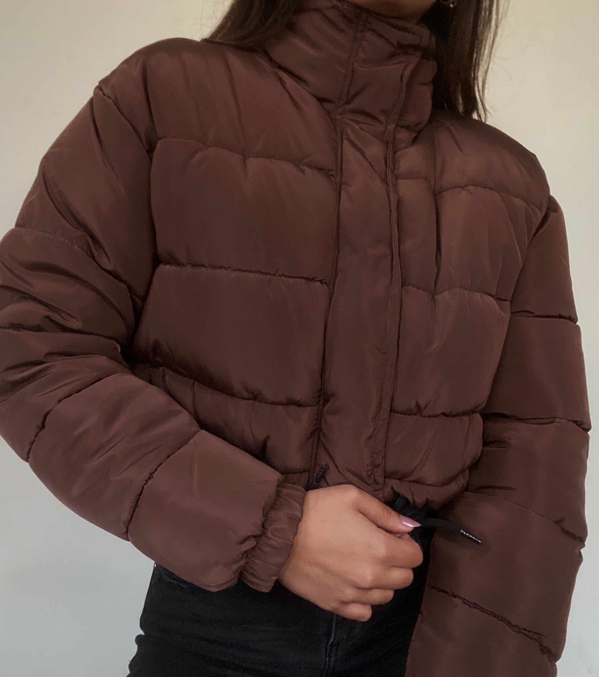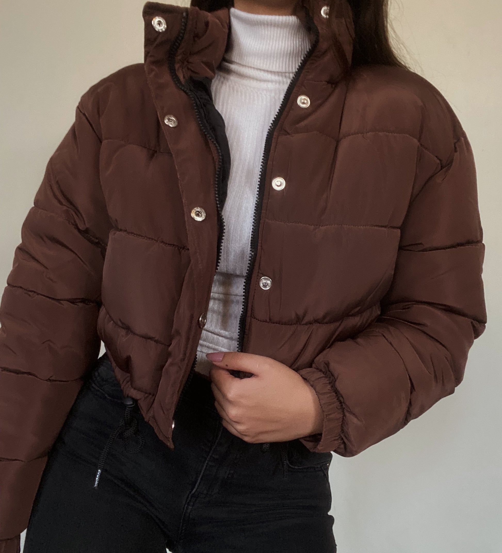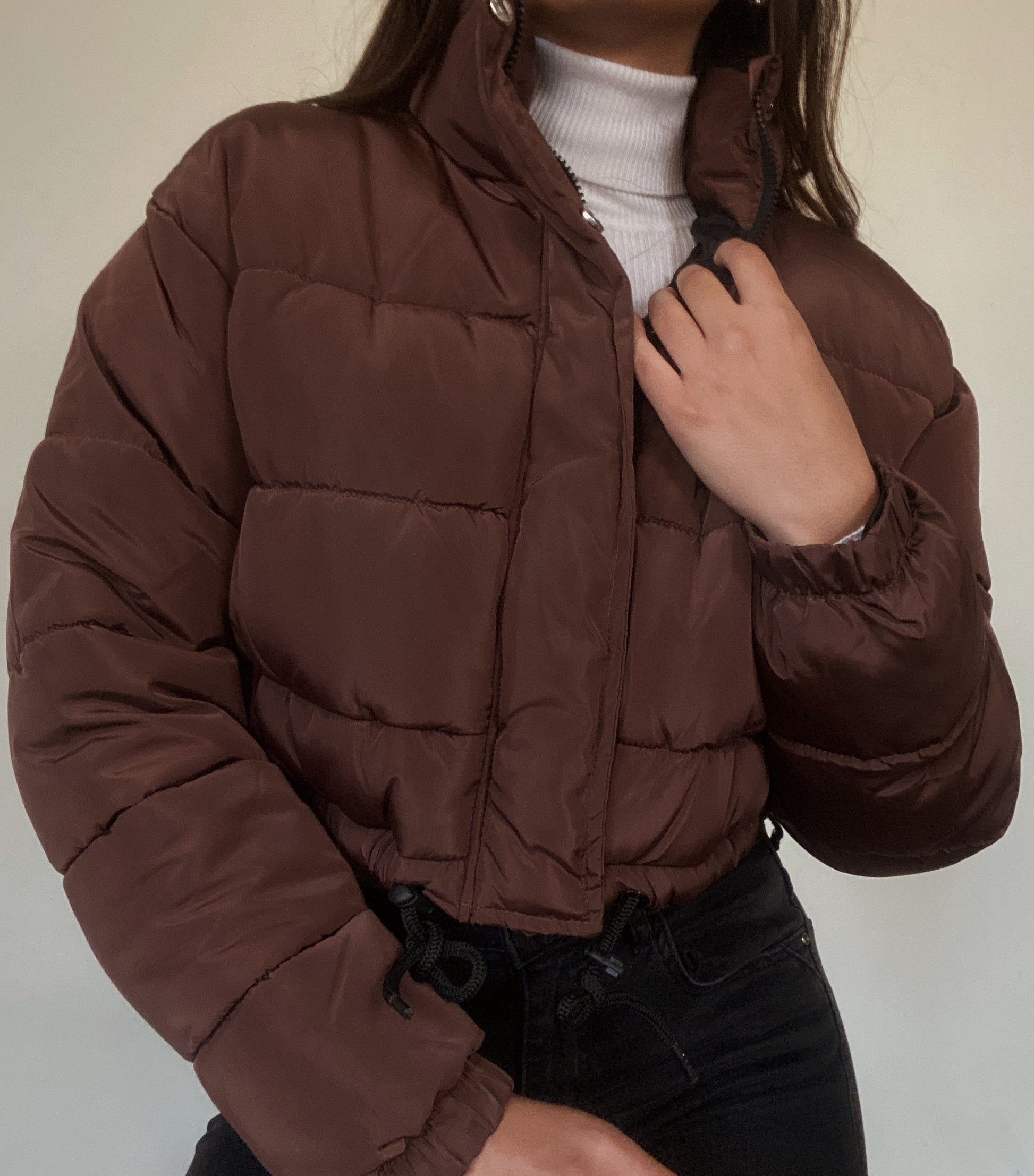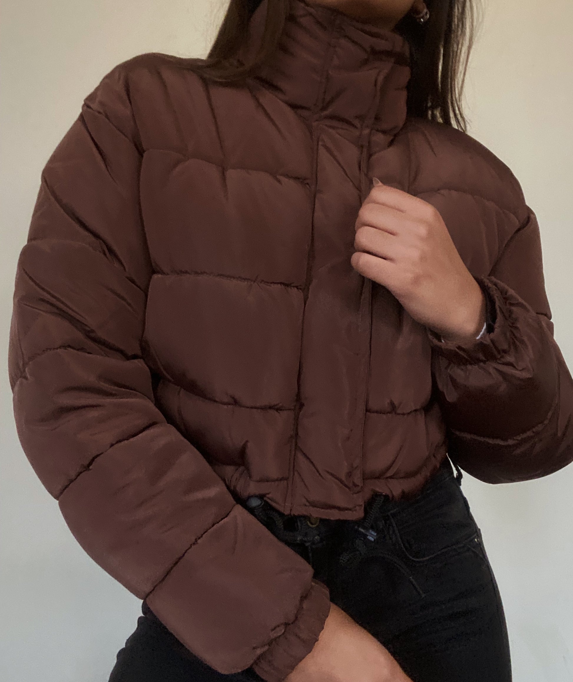 The perfect chocolate brown cropped puffer, super puffy and lightweight. Perfect for winter.