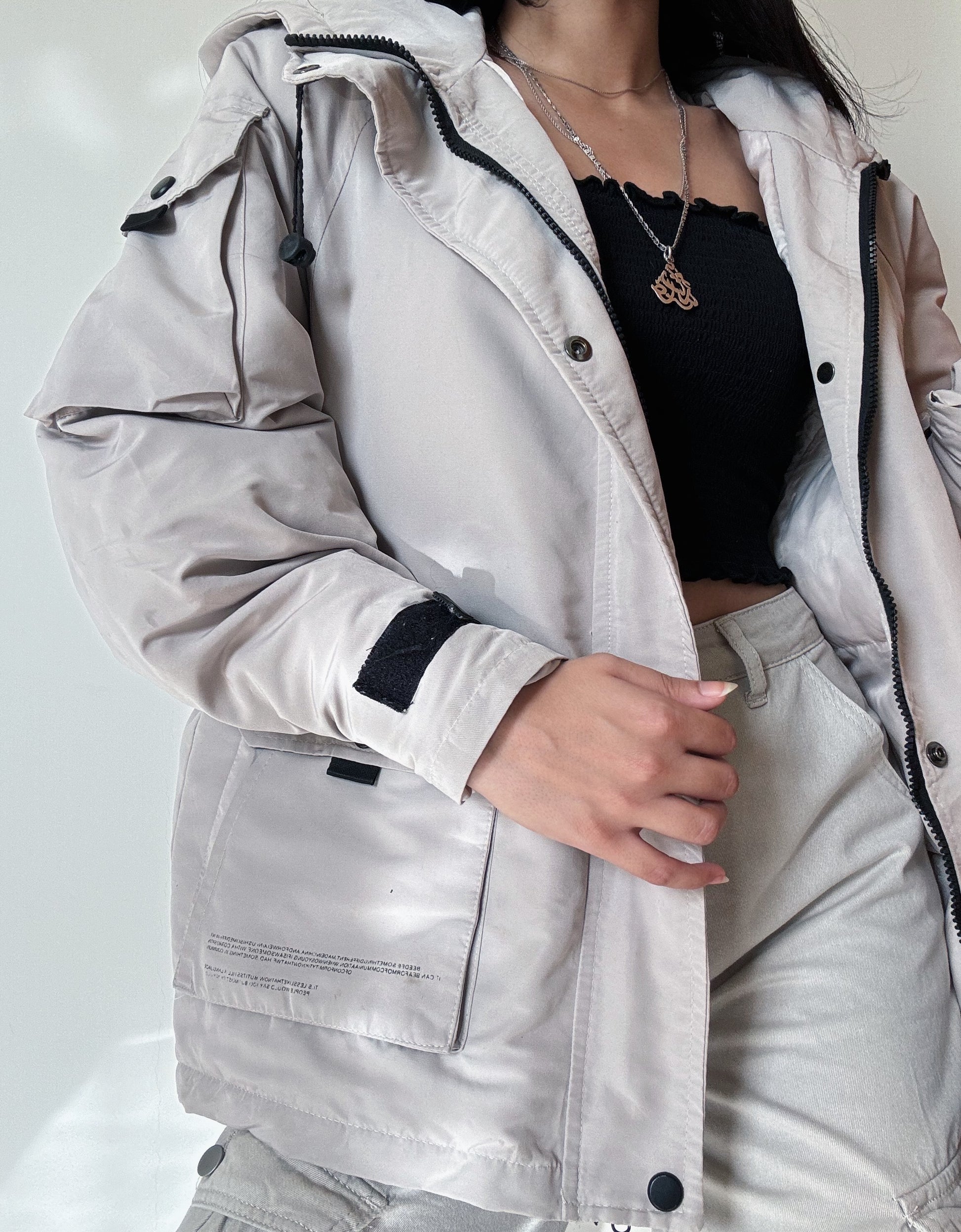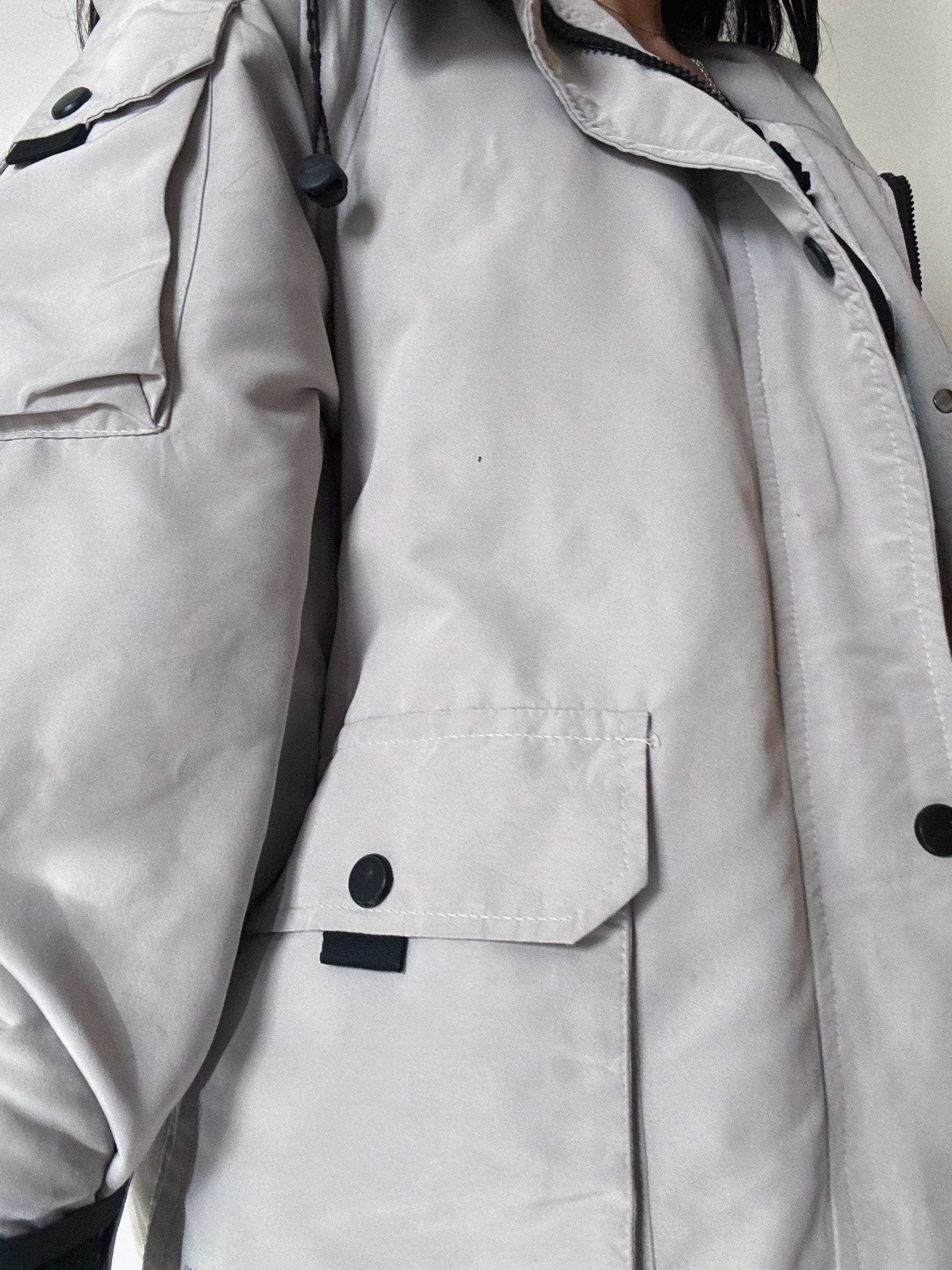 Korean style puffer jacket - fabric slightly burnt in the front, shown in last pictures.