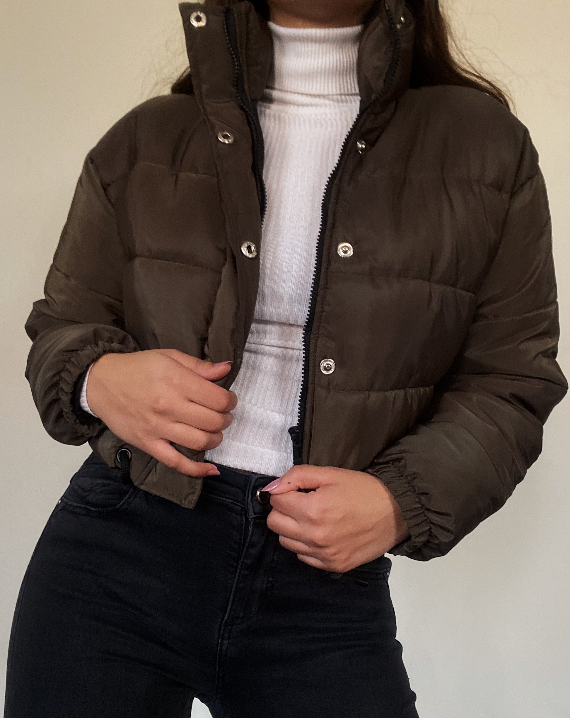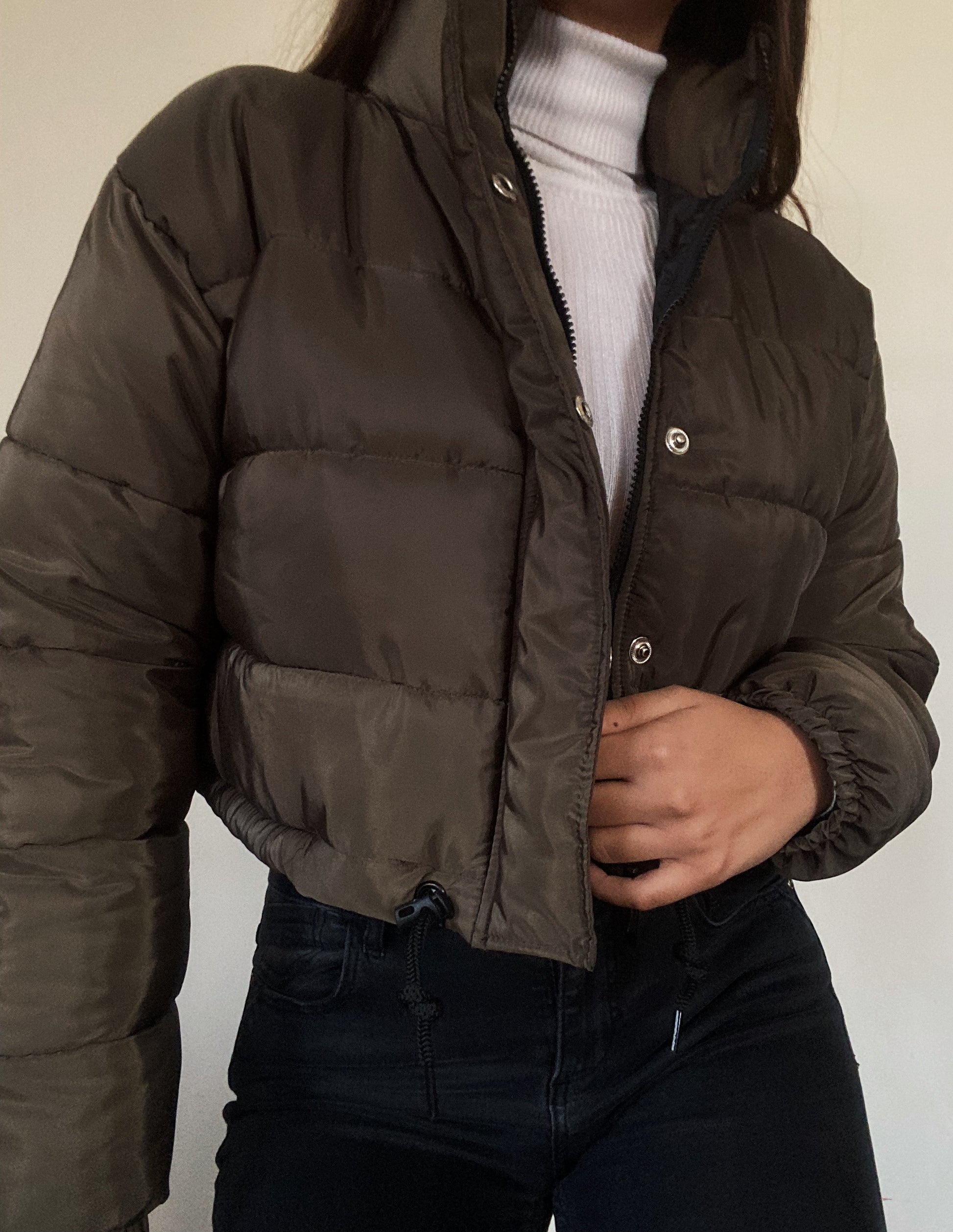 The perfect navy green cropped puffer, super puffy and lightweight. Perfect for winter.